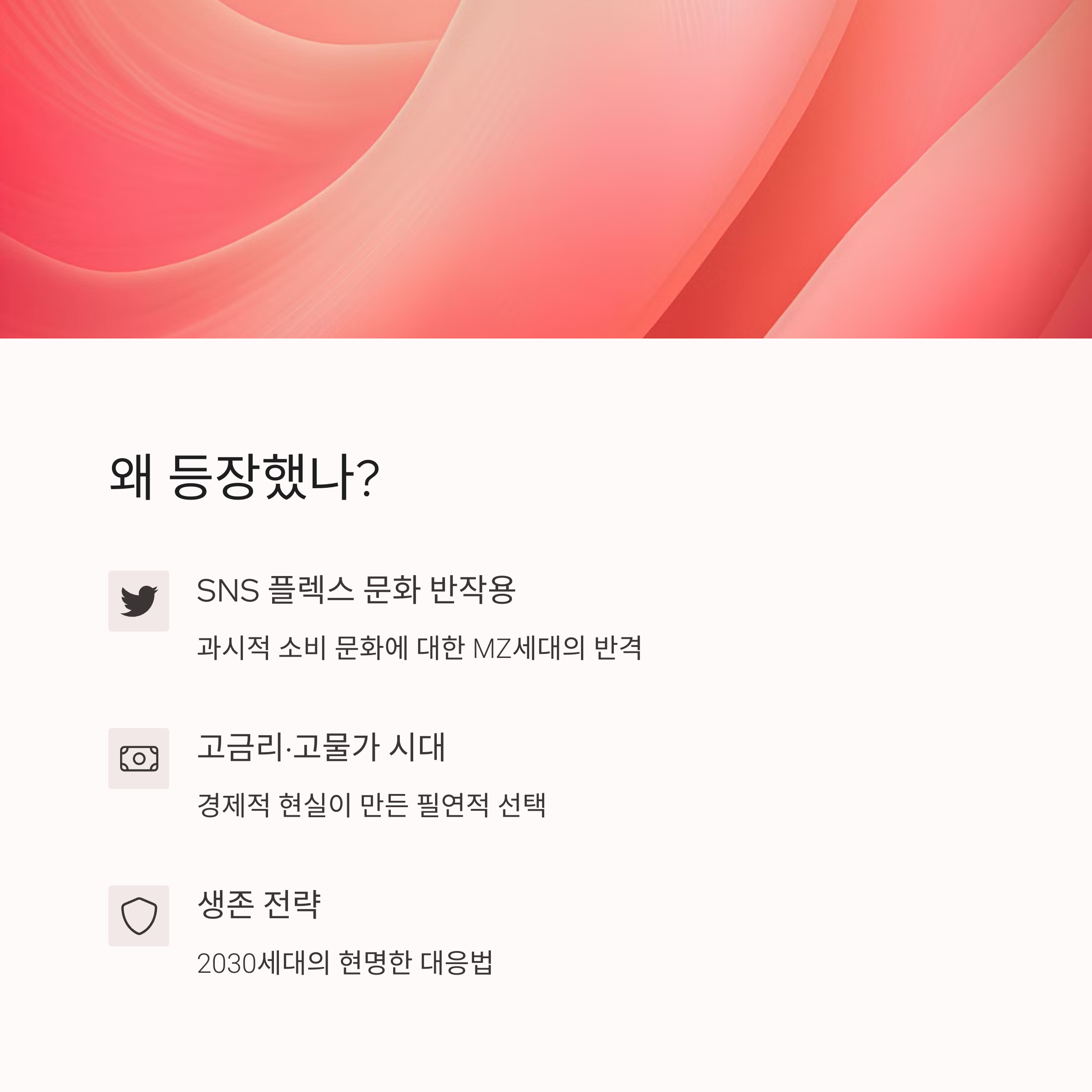 ์ํฐ ํ๋ ์ค(Anti-Flex)๋ ๊ณผ์์ ์๋น์ ๋ฐ๋ ๊ฐ๋ ์ผ๋ก, ์ ์ฝ๊ณผ ํฉ๋ฆฌ์ ์ธ ์๋น๋ฅผ ์๋์ค๋ฝ๊ฒ ๋๋ฌ๋ด๋ ๋ฌธํ๋ฅผ ์๋ฏธํฉ๋๋ค. 'ํ๋ ์ค(Flex)'๊ฐ ์์ ์ ๋ถ์ ๋ฅ๋ ฅ์ ๊ณผ์ํ๋ ํ์๋ผ๋ฉด, ์ํฐ ํ๋ ์ค๋ ์ผ๋ง๋ ํ๋ช ํ๊ฒ ๋์ ์๊ผ๋์ง๋ฅผ ๊ณต์ ํ๋ ์๋ก์ด ์๋น ํธ๋ ๋์ ๋๋ค. ์ด๋ ๊ฒฝ์ ์ ๋ถํ์ค์ฑ๊ณผ ๋ฌผ๊ฐ ์์น ์๋์ Z์ธ๋๋ฅผ ์ค์ฌ์ผ๋ก ๊ธ์ํ ํ์ฐ๋๊ณ ์์ต๋๋ค.